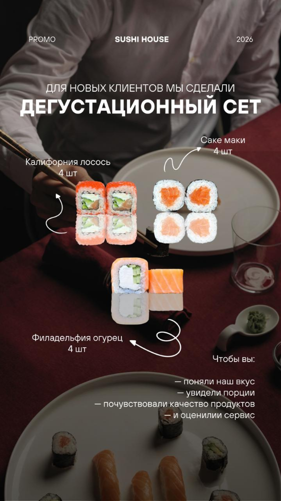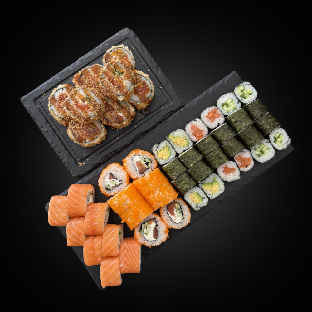 Philadelphia cucumber 8 pcsPhiladelphia tuna 8 pcsCalifornia shrimp 8 pcsSake crunch 8 pcsSake tempura 8 pcsLotus baked roll 8 pcs💮Dinamit PREMIUM roll 8 pcsMango PREMIUM roll 8 pcsTakeshi PREMIUM roll 8 pcs💮Ebi maki 4 pcsSake maki 4 pcsAvokado maki 4 pcsKappa 4 pcsUnagi maki 4 pcsTuna maki 4 pcs