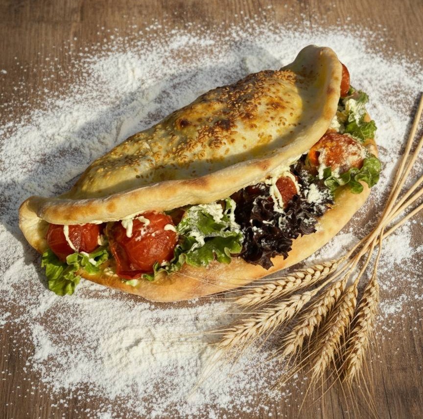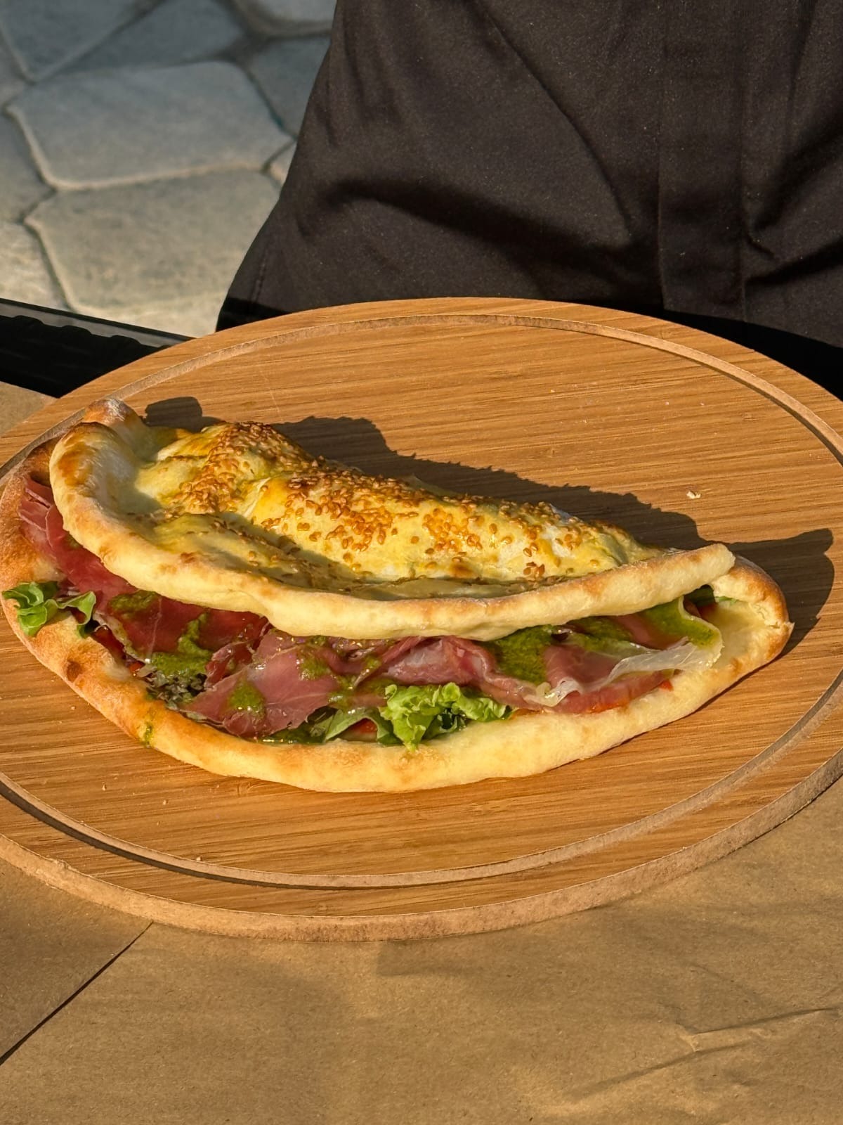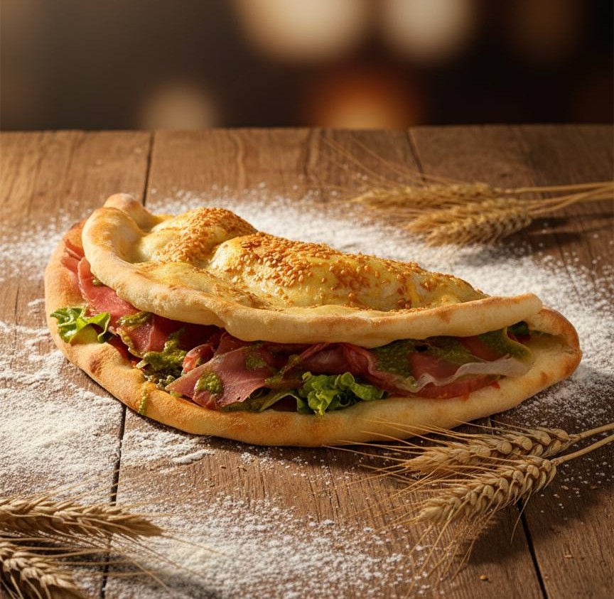 Hamur, jambon, İtalyan salamı, kırmızı sos, domates, roka, yumuşak peynir, susam