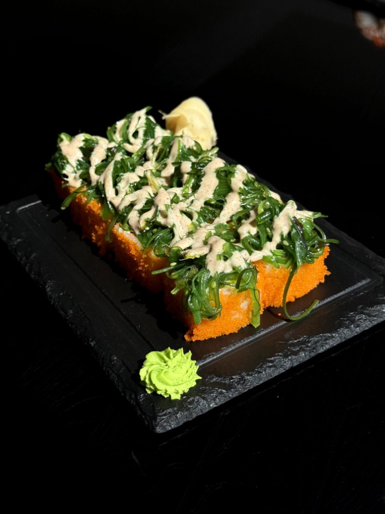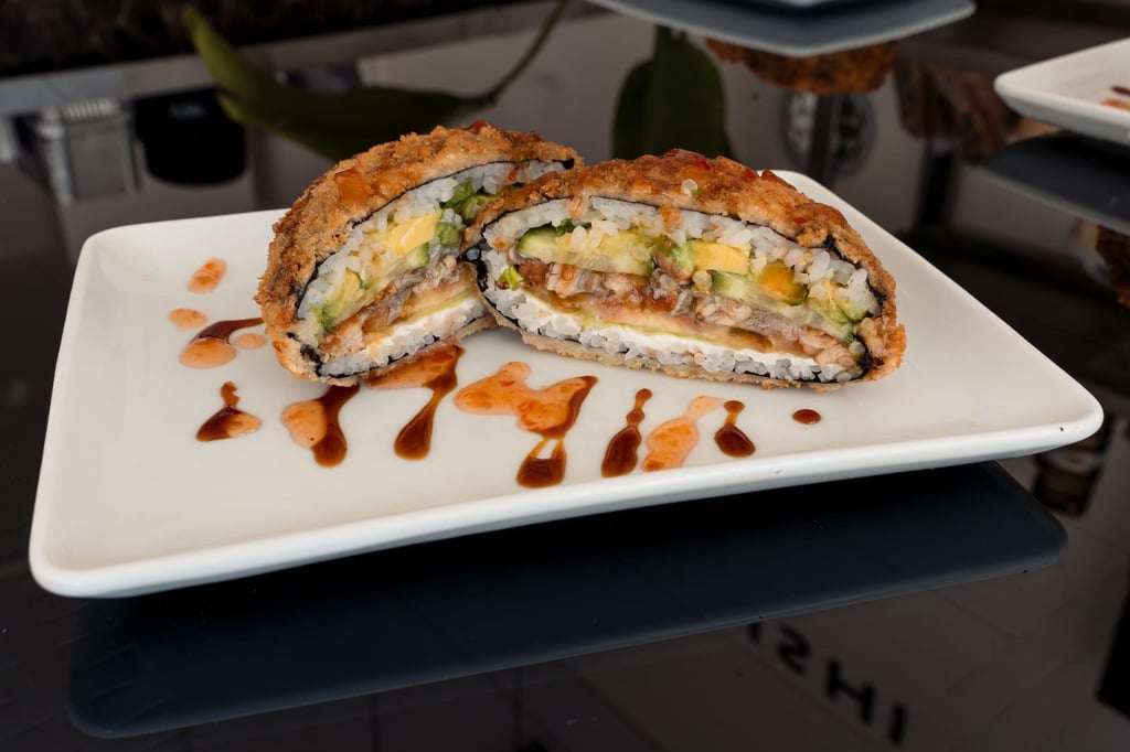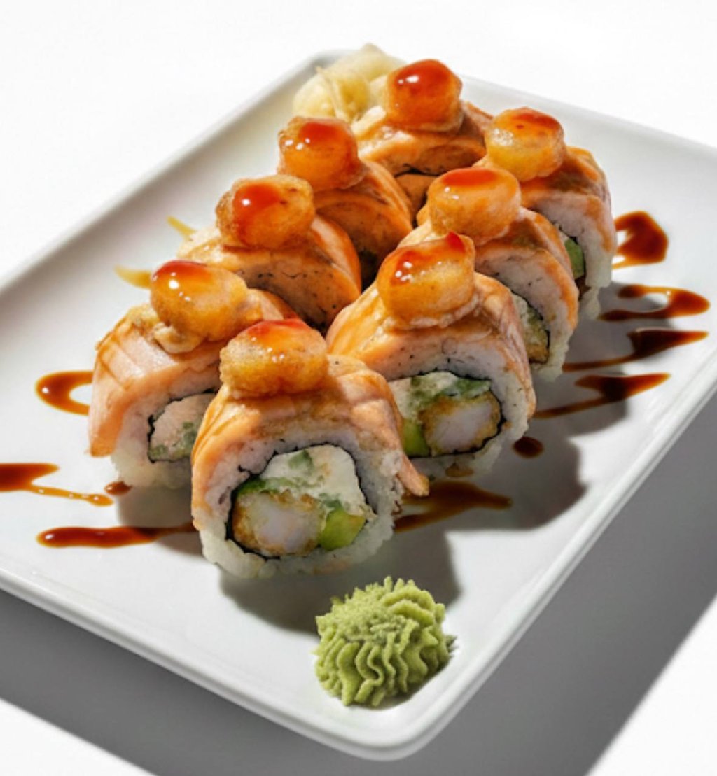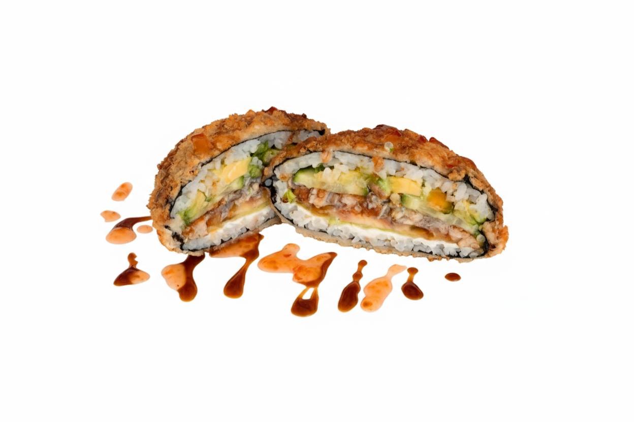Rice, nori, shrimp, mango, avocado, Philadelphia cheese, Sweet Chili sauce, sesame, unagi sauce