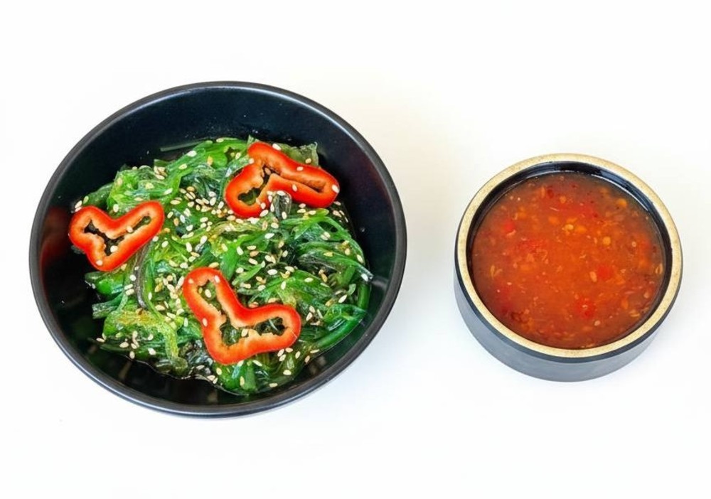 Королевская креветка, паста мисо, сыр тофу, лук-порей, вакаме, хондаси, лайм, кунжут, рис