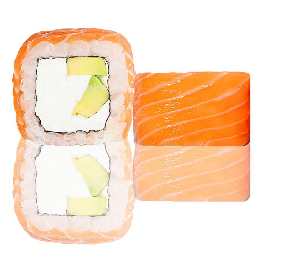 8 штук: лосось, сыр филадельфия, соус унаги, авокадо, огурец, кунжут, рис, нори