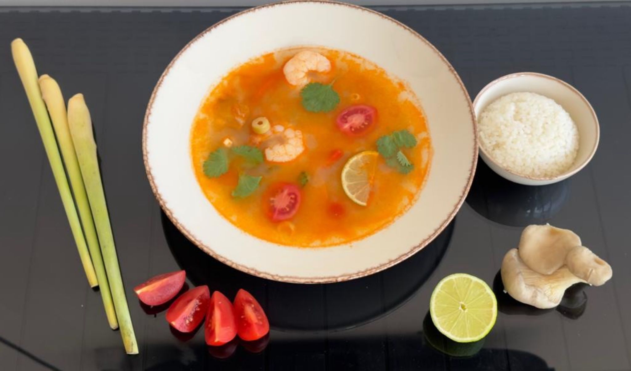 Kral karides, kalamar, ahtapot, istiridye mantarı, tom yum sosu, kiraz domates, hindistan cevizi sütü, limon otu, zencefil