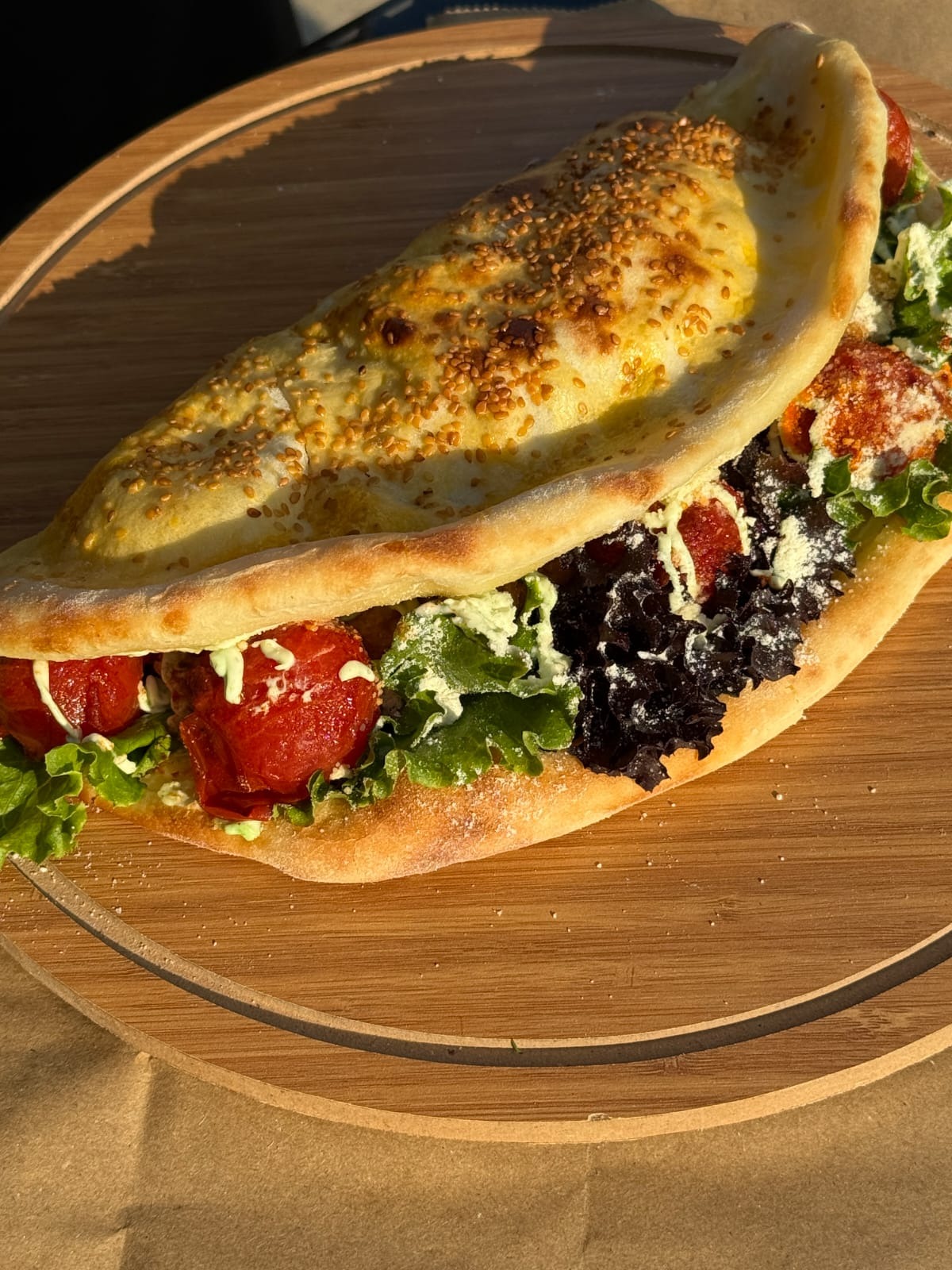Тесто, куриная грудка, соус цезарь, помидоры черри, лист салата, сыр пармезан, сыр моцарелла, кунжут