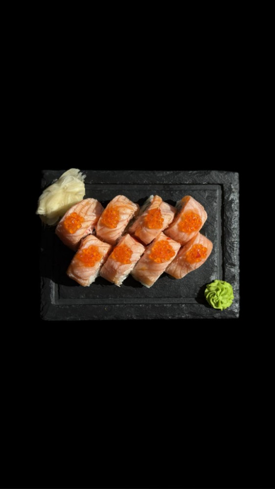 8 штук: лосось, сыр филадельфия, масаго, сырный соус, соус унаги, огурец, кунжут, рис, нори