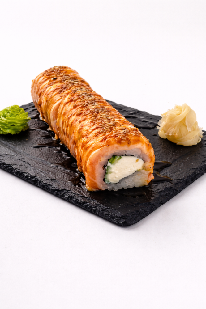 Лосось, сыр, рис, огурец, японский майонез, соус унаги, кунжут